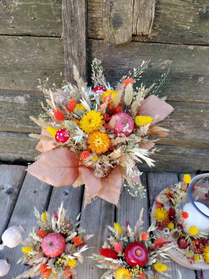 Kytica sušených kvetov, doplnená umelými jesennými doplnkami. Priemer 24-25cm. Tovar slúži iba ako dekorácia.